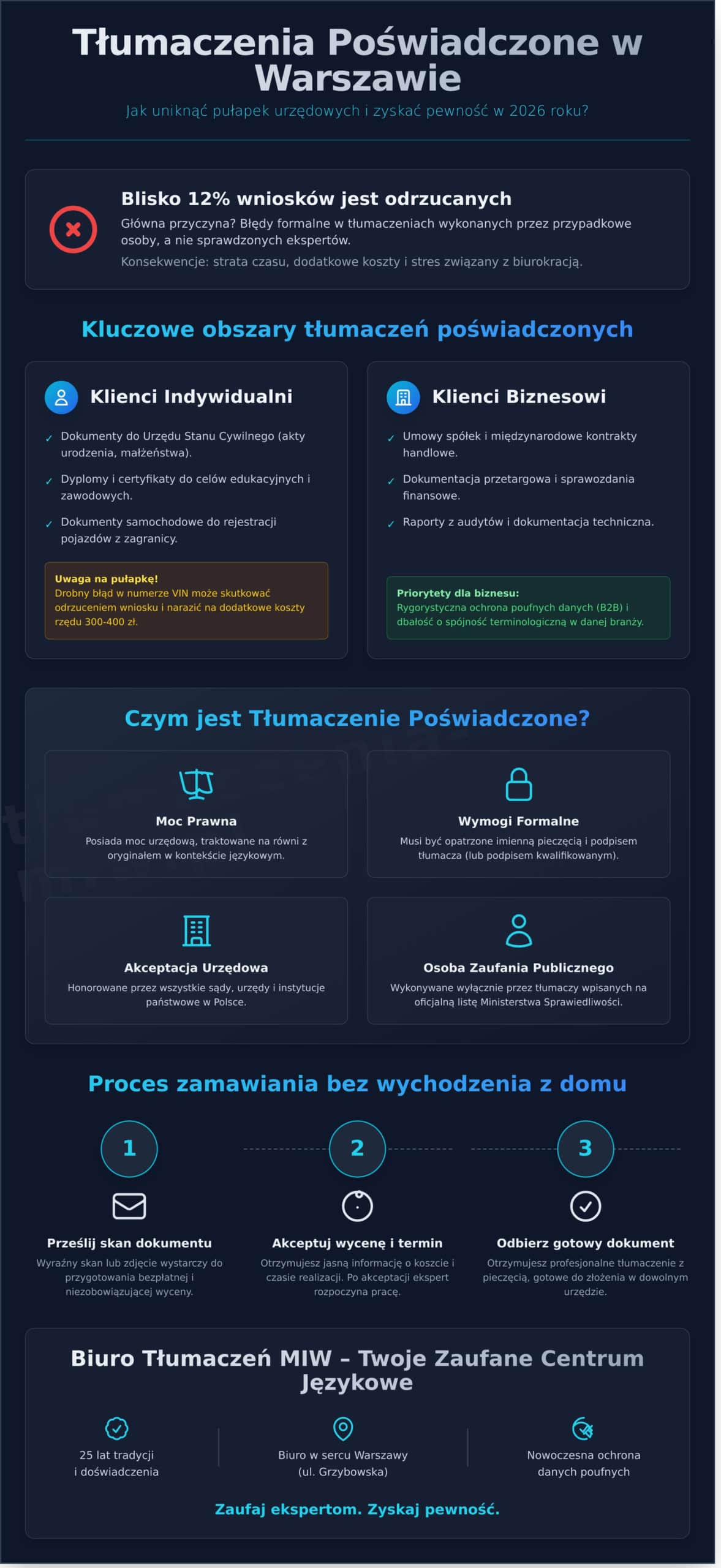 Wyobraź sobie, że po czternastu dniach oczekiwania na przekład aktu urodzenia, urzędnik w warszawskim ratuszu odsyła Cię z kwitkiem, bo w dokumencie brakuje właściwej formuły poświadczającej. Taki scenariusz spotyka blisko 12% osób, które powierzają swoje dokumenty przypadkowym osobom zamiast sprawdzonym ekspertom. To zrozumiałe, że obawiasz się odrzucenia wniosku przez urząd lub niejasnych cenników, które zmieniają się w trakcie pracy. Szukając hasła tłumaczenia warszawa, potrzebujesz przede wszystkim rzetelnej informacji i pewności, że Twój dyplom czy dokumenty samochodowe zostaną przygotowane bezbłędnie.