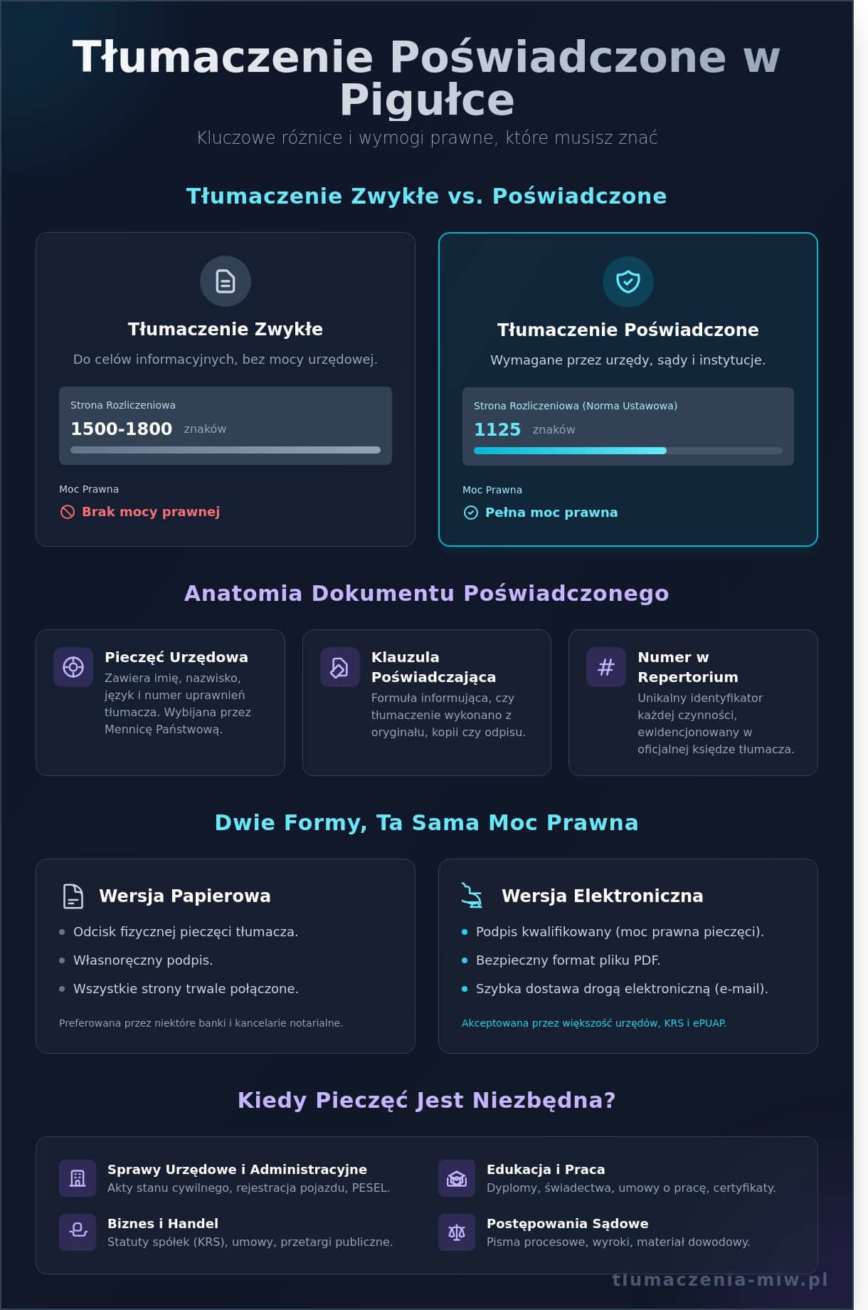 Tłumaczenie poświadczone to jedyny termin uznawany przez polski system prawny. Wynika on bezpośrednio z Ustawy o zawodzie tłumacza przysięgłego z dnia 25 listopada 2004 roku. Chociaż w mowie potocznej najczęściej pojawia się określenie „tłumaczenie przysięgłe”, to w oficjalnej korespondencji z urzędami spotkasz się wyłącznie z pojęciem poświadczenia. Taka forma przekładu posiada pełną moc prawną i jest traktowana na równi z oryginałem dokumentu.